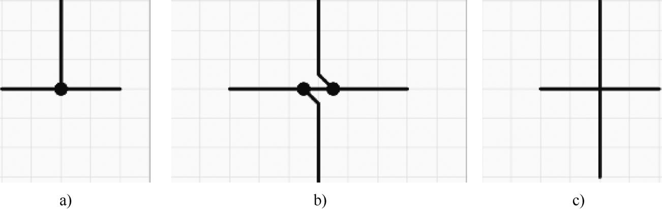 ● Convert Cross-Junctions:用于设置在所有的连线交叉处添加连接点符号,使交叉的连线导通。在两条T形节点(见图2-16a)处再连接一条导线形成十字交叉时,系统自动生成两个相邻的节点,如图2-16b所示。
