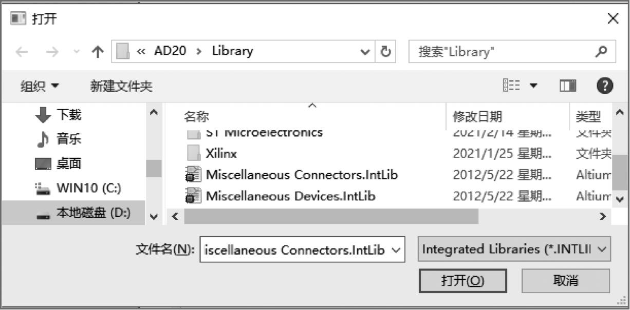 ● 想要添加一个新的元器件库,则单击“Install”按钮,系统将弹出图2-34所示的“打开”对话框。用户可以从中寻找自己想加载的元器件库,然后单击“打开”按钮,就可以把元器件库添加到当前开发环境中了。