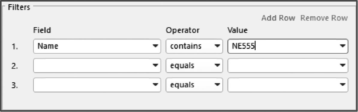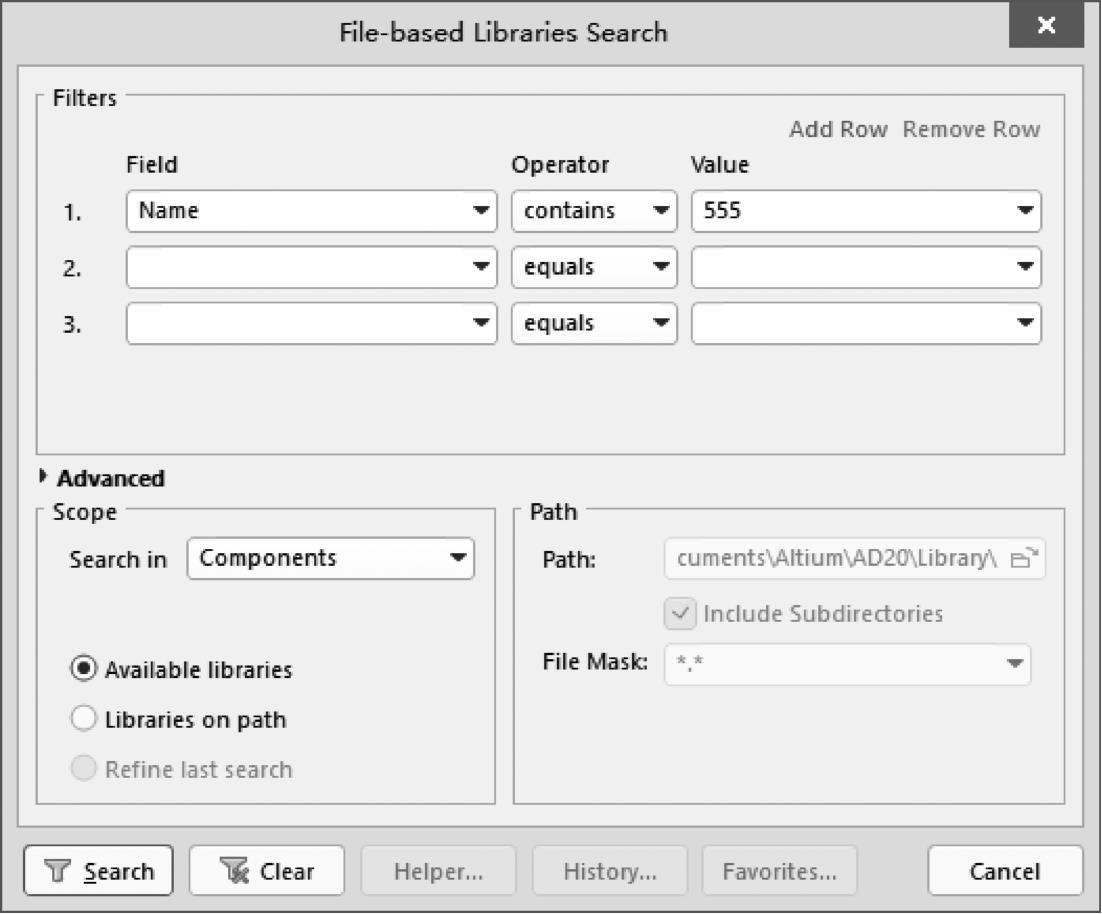 如果不确定元器件的完整名称,可只填写查找的部分名称进行模糊搜索,图2-39中的“Operator”选项选择“contains”,“Value”文本框中输入“555”的查找结果,如图2-41所示。