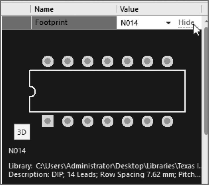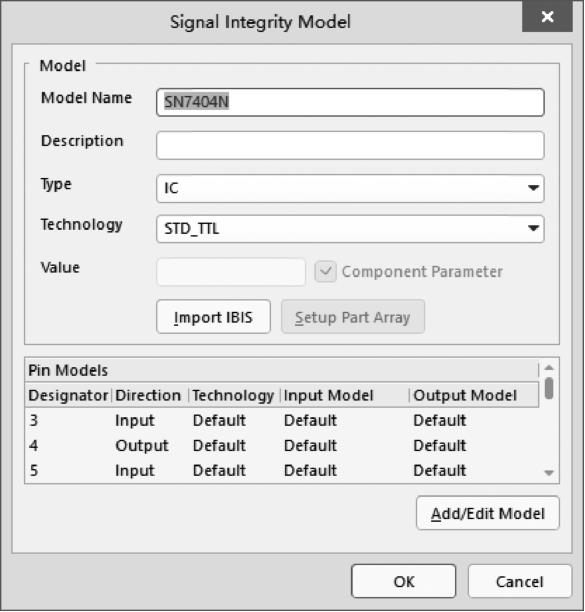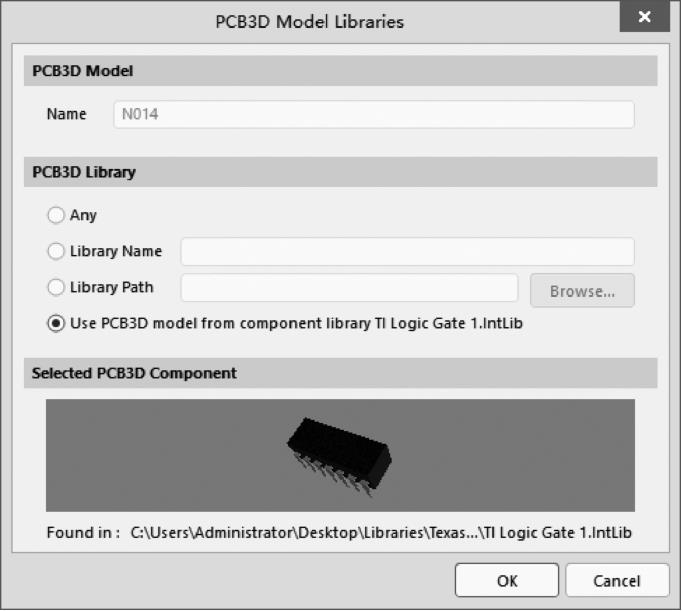 元器件的封装名为“N014”,单击“Show”选项可显示封装样式,同时“Show”变为“Hide”,如图2-47所示。3D模型(PCB3D)名为“N014”,双击图2-46中“PCB3D”选项,弹出“PCB3D Model Libraries”对话框,如图2-48所示。信号完整性分析模型名称为“SN7404N”,双击图2-46中的“Signal Integrity”选项,弹出“Signal Integrity Model”对话框,如图2-49所示。