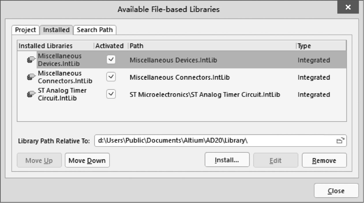 ● 使用“Move Up”和“Move Down”按钮,可以把列表中已选中的元器件库上移或下移,以改变其在元器件库管理器中的显示顺序。