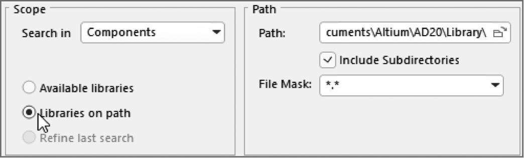 2)设置查找的范围。当选中“Available libraries”单选按钮时,则在已经装载的元器件库中查找;选中“Libraries on path”单选按钮时,则在右侧“Path”选项组指定的路径中进行查找,如图2-38所示。