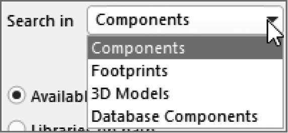 1)设置元器件查找类型,在图2-36中的“Scope”选项组中,单击“Search in”下拉按钮,在下拉列表中并选择查找类型,如图2-37所示。4种查找类型分别为元器件、封装、3D模式和数据库元器件。