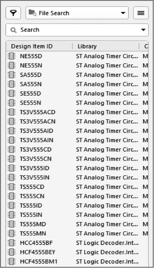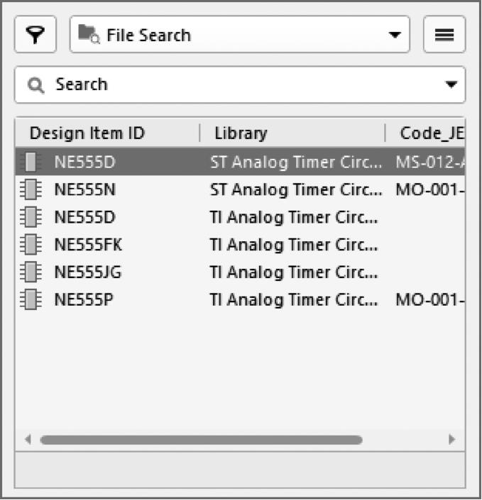 【例2-2】 利用元器件查找功能搜索“NE555”元器件。
