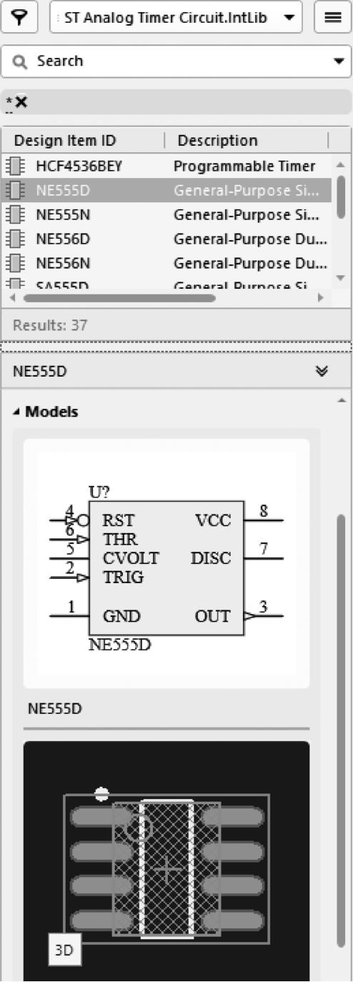 2)在“Components”面板的“Libraries”下拉列表框中选择“ST Analog Timer Circuit.IntLib”选项,然后在元器件列表框中选择NE555D。