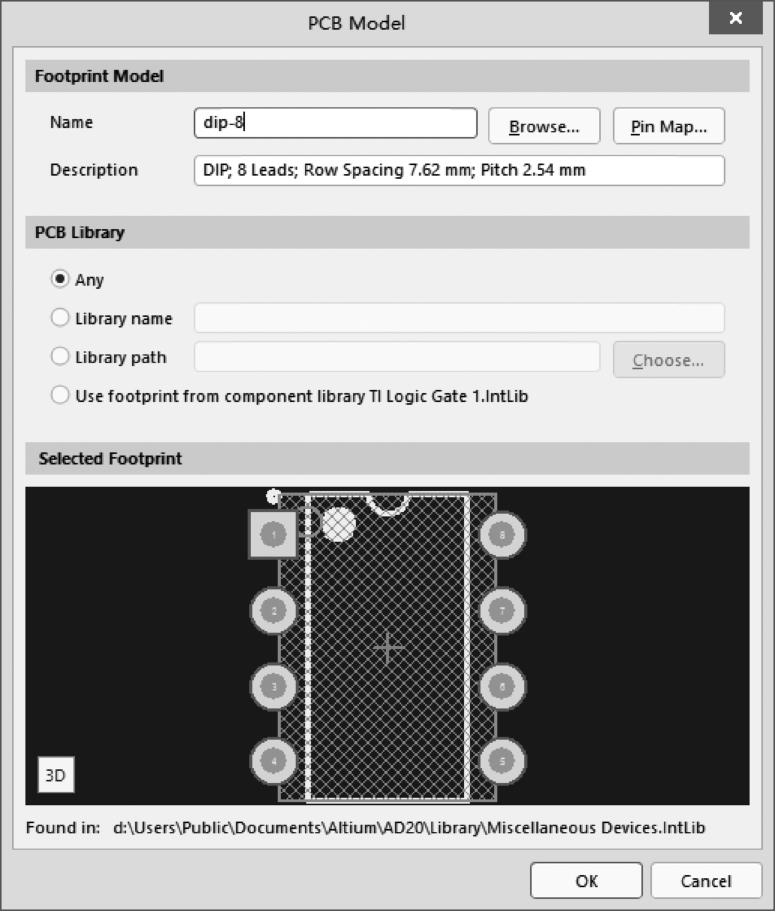 1)在图2-46所示的“Parameters”选项组中,单击“Add”按钮,在下拉列表中选择“Footprint”选项,系统将弹出图2-51所示的“PCB Model”对话框,在该对话框中可以设置PCB封装的属性。