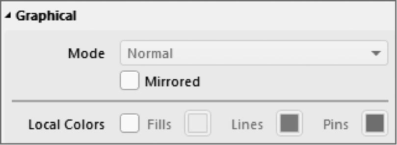4)“Graphical”选项组显示了当前元器件的图形信息,包括填充颜色、线条颜色、引脚颜色,以及是否镜像处理等,如图2-50所示。