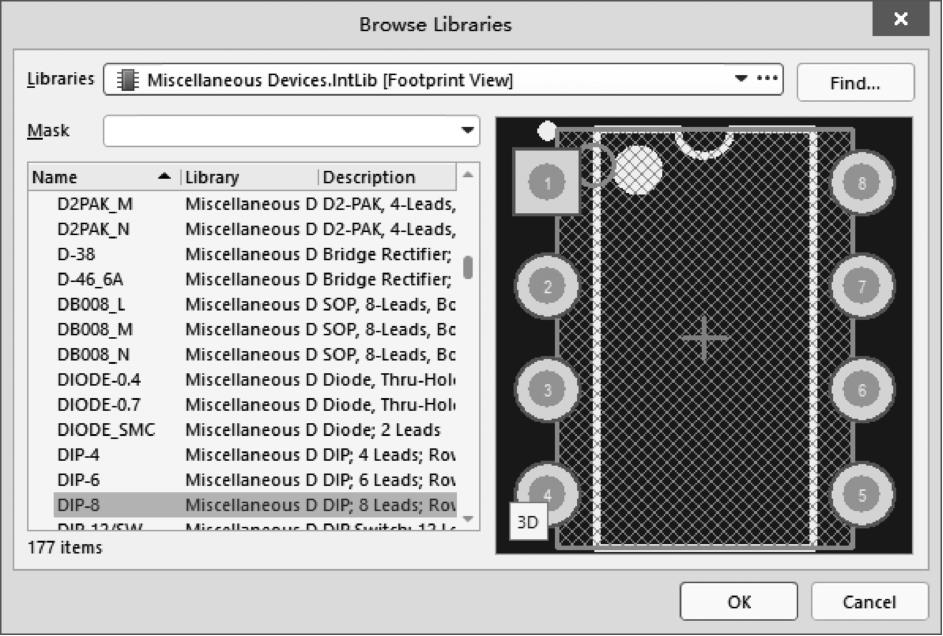 3)单击“Browse”按钮,系统弹出图2-52所示的“Browse Libraries”对话框,此时可以选择封装类型,然后单击“OK”按钮即可。