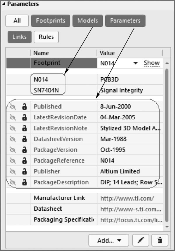 3)图2-46所示为元器件“SN7404N”的“Parameters”选项组,该选项组是用于选择元器件的封装(Footprints)、模型(Models)和参数(Parameters)列表等。