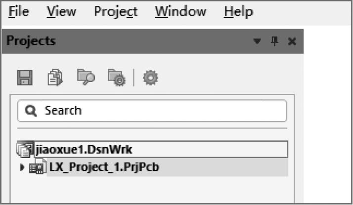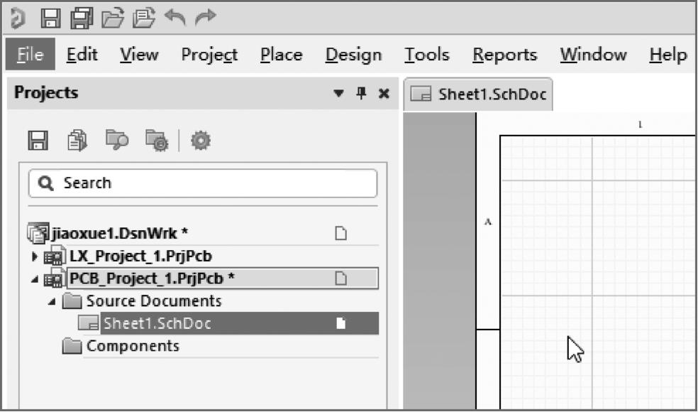 1)启动Altium Designer,在“Projects”工作面板中选择名为“jiaoxue1.DsnWrk”的设计工作区。