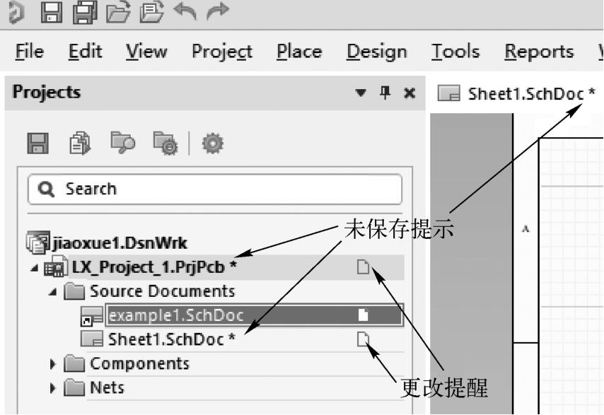 在Altium Designer中,用户的项目操作均在内存中进行,即新建的文件或者项目,在被用户保存前,都储存在内存中,Altium Designer不会将这些文件自动写到磁盘上。因此,如果设计者在新建项目文件后关闭该项目时未保存文件,那么这个文件将会自动从内存中释放。为防止出现误操作,Altium Designer提供了文件更改提醒功能,如果用户对设计工作区、项目或者文件进行了修改,在“Projects”面板上当前设计工作区名称和当前项目名称后都会出现“∗”,如图2-13所示,表示该设计工作区和项目都已更改,但是未被保存,以此提醒用户保存。