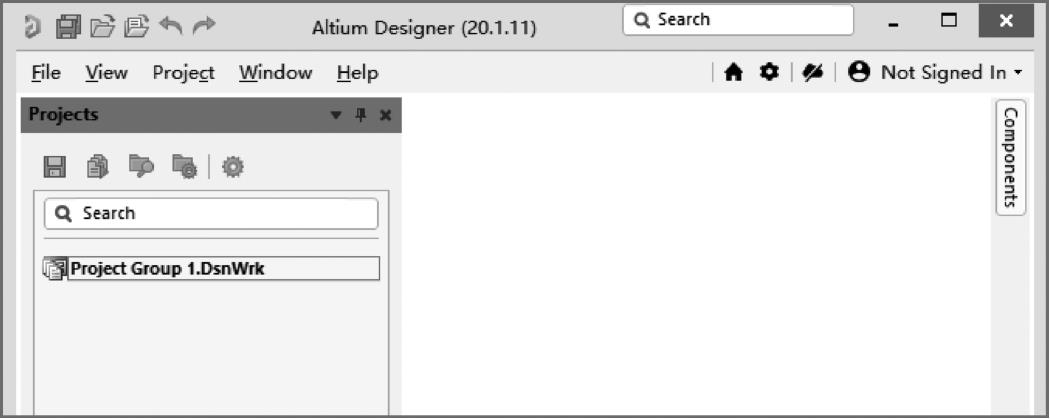 Altium Designer 20启动后会自动新建一个默认名为Project Group 1.DsnWrk的设计工作区,设计者可直接在该默认设计工作区下创建项目,也可以自己新建设计工作区。