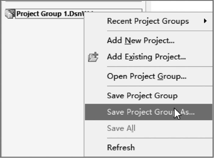 3)执行“File”→“Save Project Group As”命令,如图2-2所示;或者右击图2-1中的“Projects”工作面板中所创建的设计工作区名称,打开图2-3所示的快捷菜单,选择“Save Project Group As”命令,打开图2-4所示的“Save[Project Group 1.DsnWrk]As”对话框。