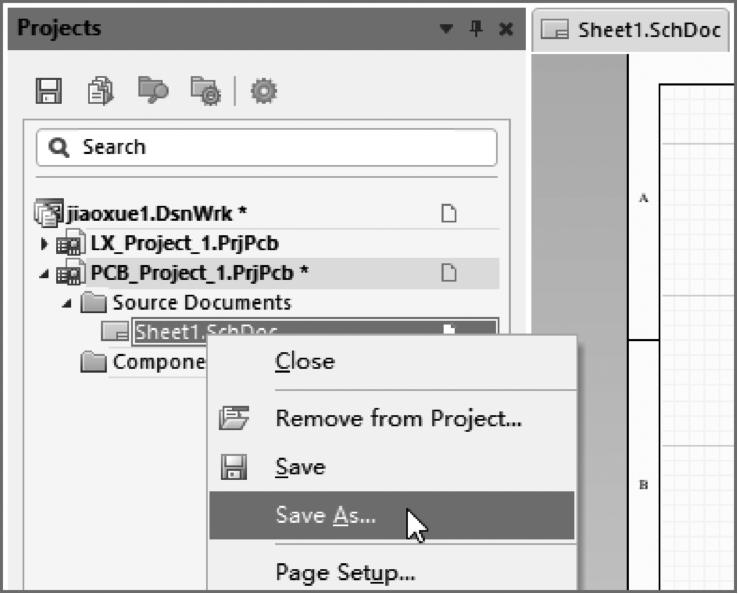 3)执行“File”→“Save As”命令;或者在“Projects”工作面板中的原理图文件名称上右击,在图2-11所示的快捷菜单中,选择“Save As”命令。打开“Save[Sheet1.SchDoc]As”对话框,如图2-12所示,在该对话框的“文件名”文本框中输入需要更改的文件名“Example1”,单击“保存”按钮。将文件更名为“Example1.SchDoc”。