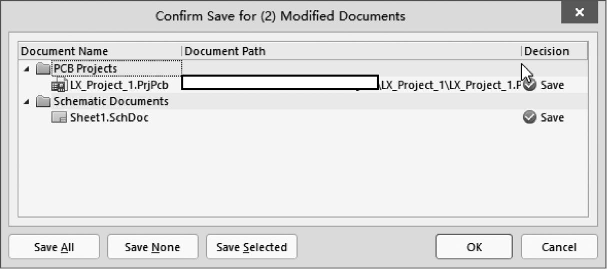 Don’t Save表示不保存对应文件。单击“OK”按钮,系统即会自动保存选中的文件,退出Altium Designer软件。