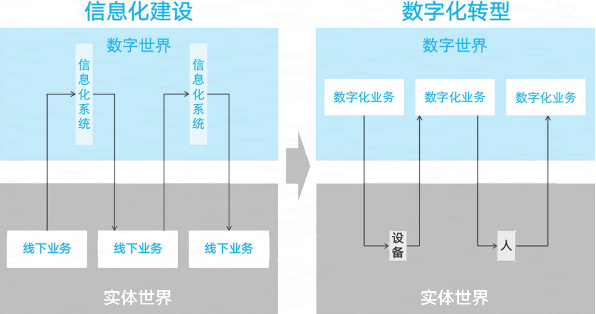 信息化建设和数字化转型有着相同的背景,那就是实体世界和数字世界的交互。在信息化时期,企业大部分的业务是在线下完成的,也就是在实体世界里靠人与人、人与设备的交互来完成业务上的操作,而信息化系统的典型代表就是办公自动化系统。例如,在处理公文审批流程时,工作人员完成某一个环节后,需要该环节负责人在纸质文件上盖章签字,然后文件随流程流转到下一个部门,仍然需要盖章签字,整个处理流程都是依靠人力在线下实现的。为了减少人员跑动,也避免因为人不在办公室导致流程中断,一些企业引入了办公自动化系统,这样工作人员只要使用办公网络就可以跟进该审批流程。但是,我们发现原来业务的实际执行还是在线下的,只是把盖章签字的单个环节搬到了线上,仅提高了这个环节的审批效率。