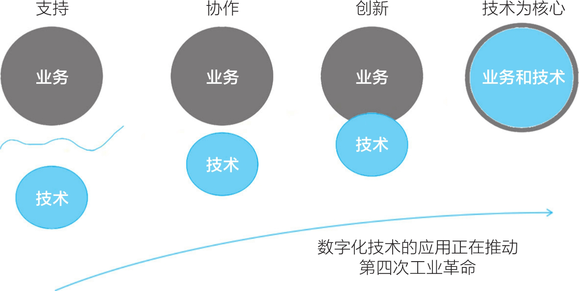 随着技术的发展,技术与业务的关系一直在不断演进、发生变化,图1-5是软件咨询公司Thoughtworks总结的技术与业务关系演进的4个阶段。