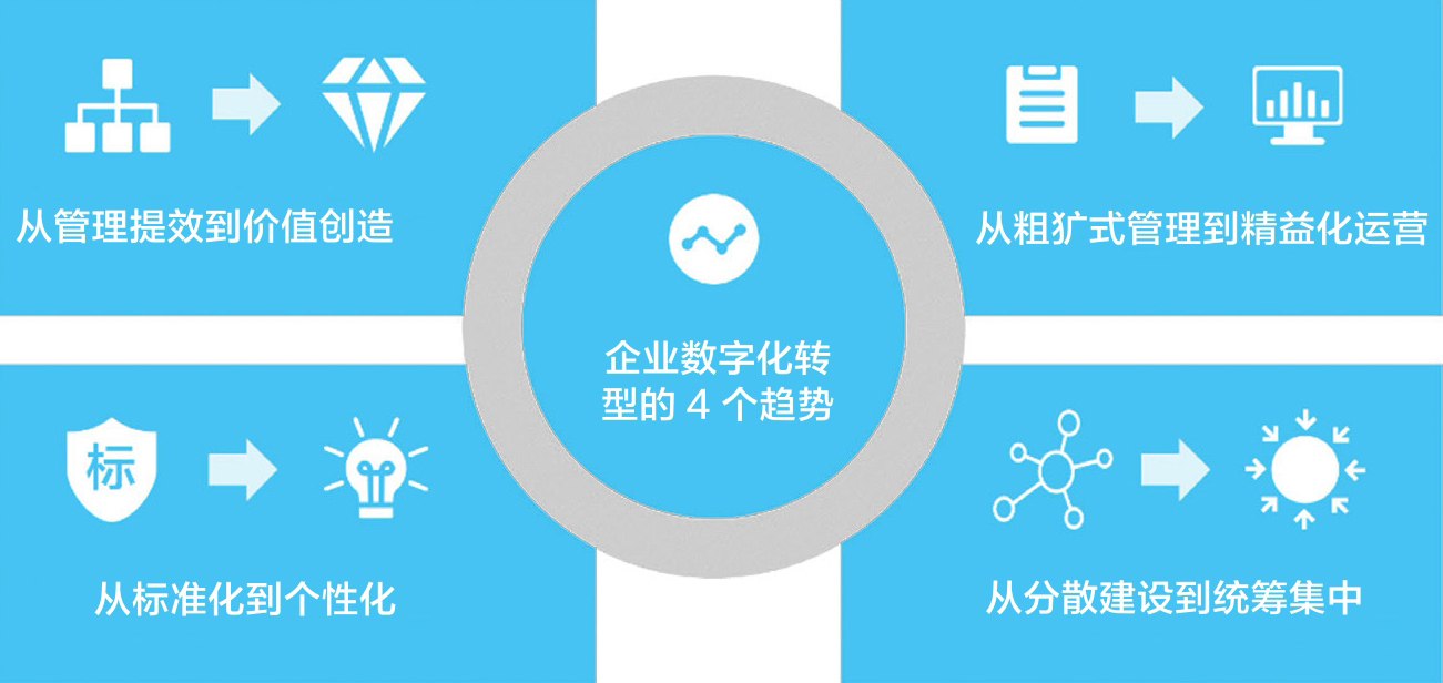 在过去几年间,笔者参与了多个大型集团企业的数字化转型。虽然这些企业的规模、所处行业都不尽相同,但是其转型却有一些共同之处,可以总结为以下4个趋势:从管理提效到价值创造,从粗犷式管理到精益化运营,从标准化到个性化,从分散建设到统筹集中,如图1-7所示。