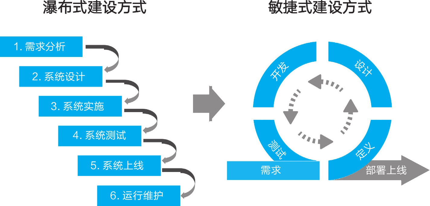 在图1-6中,左边是信息化建设时期的经典方法——瀑布式建设方式。采用该方式建设系统时,从接到业务部门的需求开始,依次进行需求分析、系统设计、系统实施、系统测试、系统上线、运行维护的相关步骤。在系统运行一段时间后,工作人员再根据搜集的新的改进意见和需求,启动新一轮的建设,仍从需求分析开始。