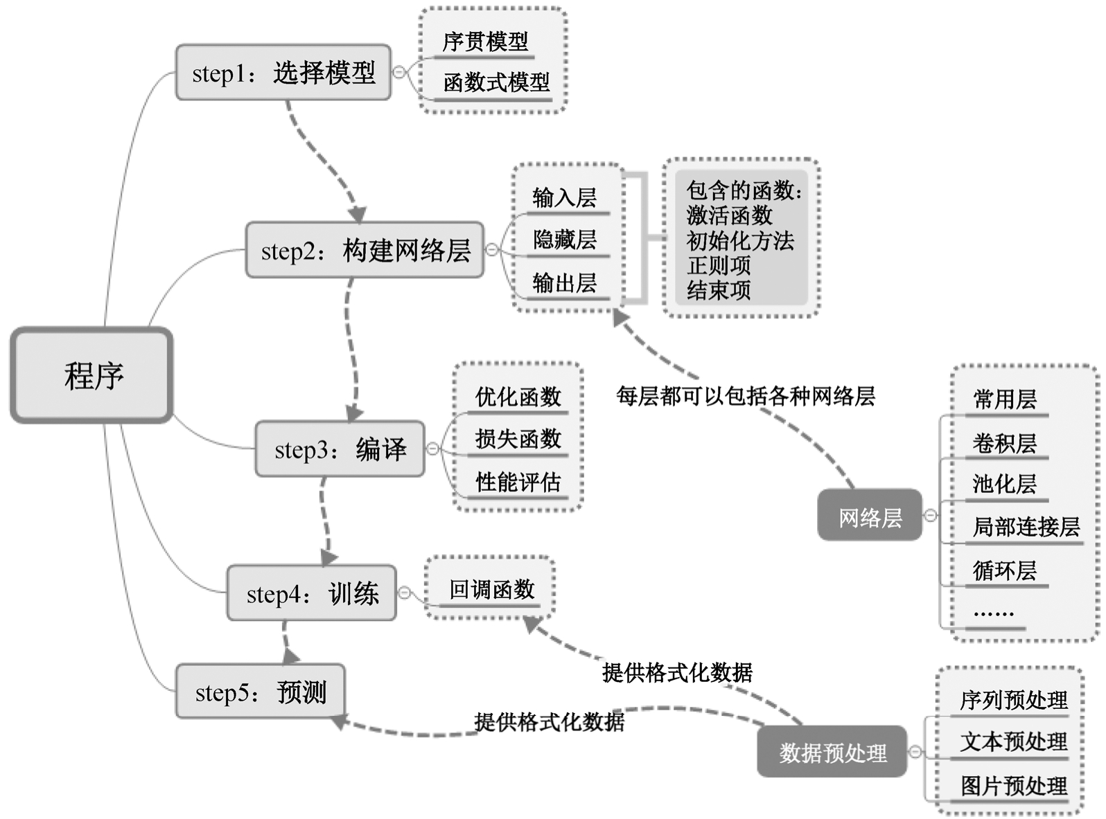 使用Keras搭建一个神经网络有5个步骤,具体如图2-14所示。