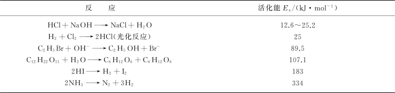 活化能一般为正值,许多化学反应的活化能与破坏一般化学键所需的能量相近,为40~400 kJ·mol -1 ,多数在60~250 kJ·mol -1 ,活化能小于40 kJ·mol -1 的化学反应,其反应速率极快,用一般方法难以测定;活化能大于400 kJ·mol -1 的反应,其反应速率极慢,难以察觉。表1-6 列出了一些反应的活化能。