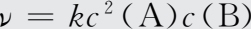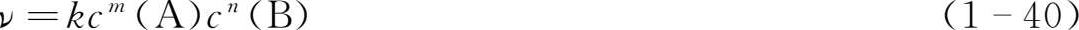 即在一定温度下,化学反应速率与各反应物浓度幂的乘积成正比(幂指数在数值上等于基元反应中反应物的计量系数),这个规律称为质量作用定律。式(1-40)是质量作用定律的数学表达式,也称为反应速率方程。式中,ν为该基元反应的瞬时速率,c(A)和c(B)为反应物A和B的瞬时浓度,k为速率常数。速率常数的大小与反应温度有关,不随反应物浓度而变化。