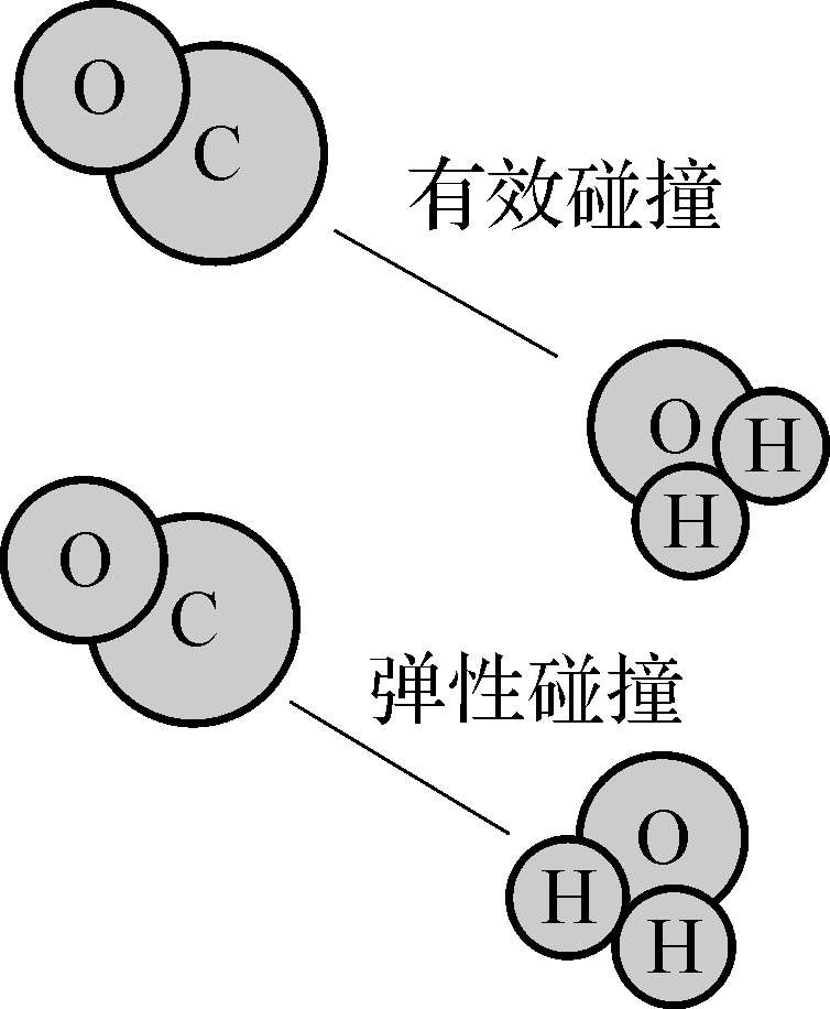 只有当高能量的CO(g)分子中的C原子与H 2 O(g)中的O原子迎头相碰才有可能发生反应,见图1-8。