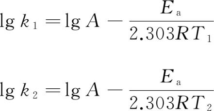 速率常数k与温度有关。对于同一化学反应,温度越高,k值越大,反应速率越快。当化学反应的温度变化不大时,E a 和A可看作是常数。若反应在温度T 1 时的速率常数为k 1 ,在温度T 2 时的速率常数为k 2 ,则