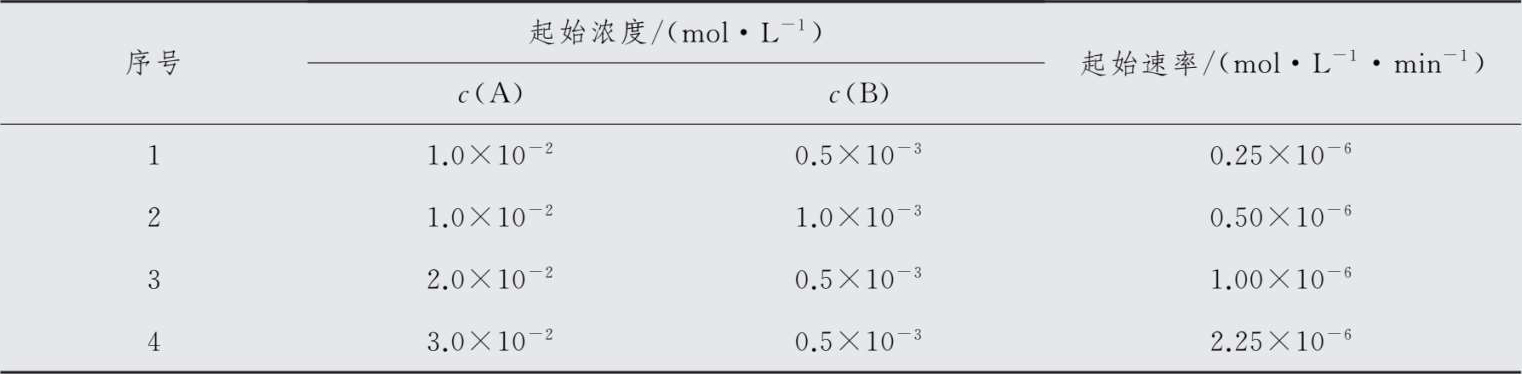 【 例1-15 】 某气体反应为基元反应,A和B为反应物,测得其实验数据如表1-7: