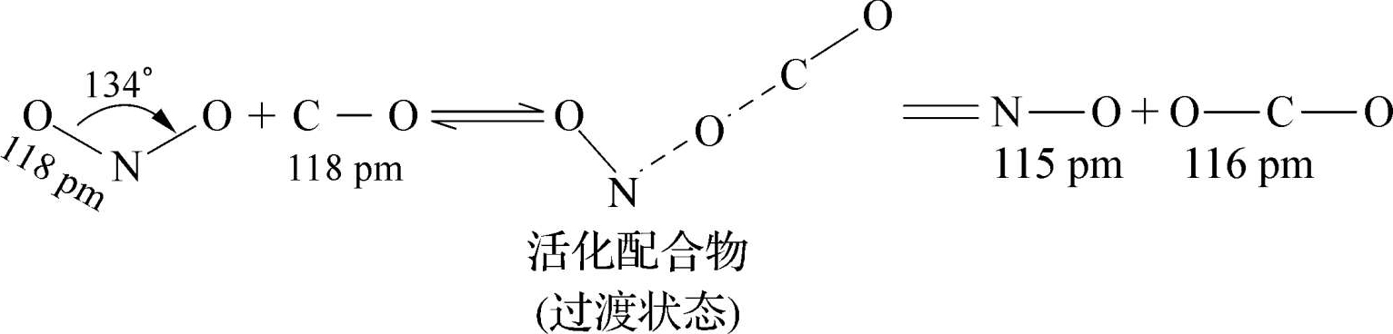 过渡状态理论认为,化学反应不只是通过反应物分子之间简单碰撞就能完成的,当两个具有足够能量的分子相互接近并发生碰撞后,要经过一个高能量的中间过渡状态,即形成一种活化配合物,然后再分解为产物。例如,在化学反应NO 2 +CO→NO+CO 2 中,当NO 2 和CO的活化分子碰撞之后,就形成了一种活化配合物[ONOCO],如图1-9 所示。