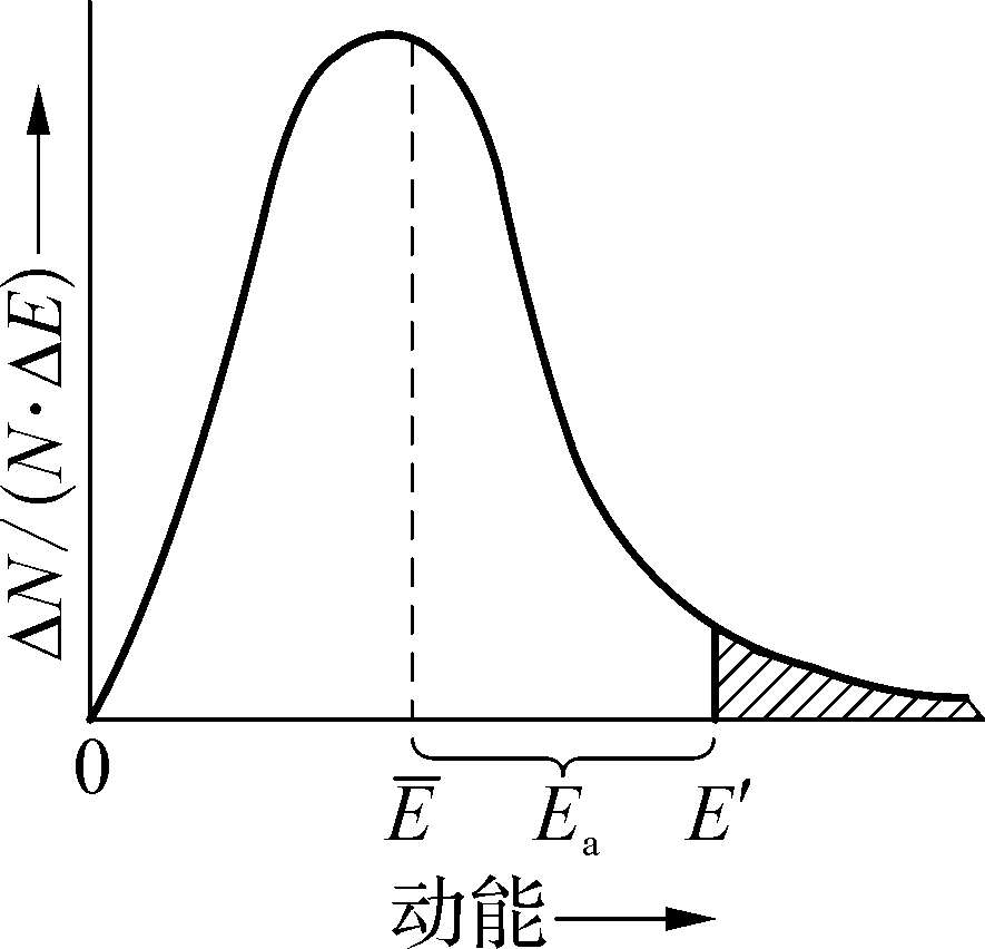 具有较大的动能并能够发生有效碰撞的分子称为活化分子。活化分子具有的最低能量与反应物分子的平均能量之差,称为活化能,用符号E a 表示,单位为kJ·mol -1 。活化能与活化分子的概念,还可以从气体分子的能量分布规律加以说明。在一定温度下,分子具有一定的平均动能,但并非每一分子的动能都一样,由于碰撞等原因,分子间不断进行着能量的重新分配,每个分子的能量并不固定。但从统计的观点看,具有一定能量的分子数目是不随时间改变的。以分子的动能E为横坐标,以具有一定动能间隔(ΔE)的分子分数(ΔN/N)与能量间隔之比ΔN/(N·ΔE)为纵坐标作图,得到一定温度下气体分子能量分布曲线,见图1-11。