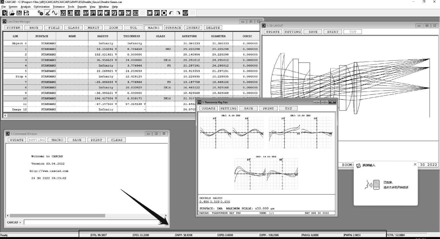 从上面的数值可以看到ISNA像空间NA是0.526 996,但真实的NA是0.598 244。CAXCAD提供了一个控制真实数值孔径的操作数IMNA,可以直接控制像方NA。 ybvaJjp0bh6rwE4MtGxozobU41T+KbBhtr9irirAK8KZSIHSfVWlcsWj6B7Znhq6