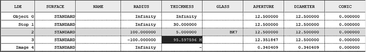 光线的Pupil Zone为0就表示是近轴光线,高度Height为0表示聚焦在轴上,由此计算出来的厚度95.597 596就是近轴焦点的位置(图1-15)。