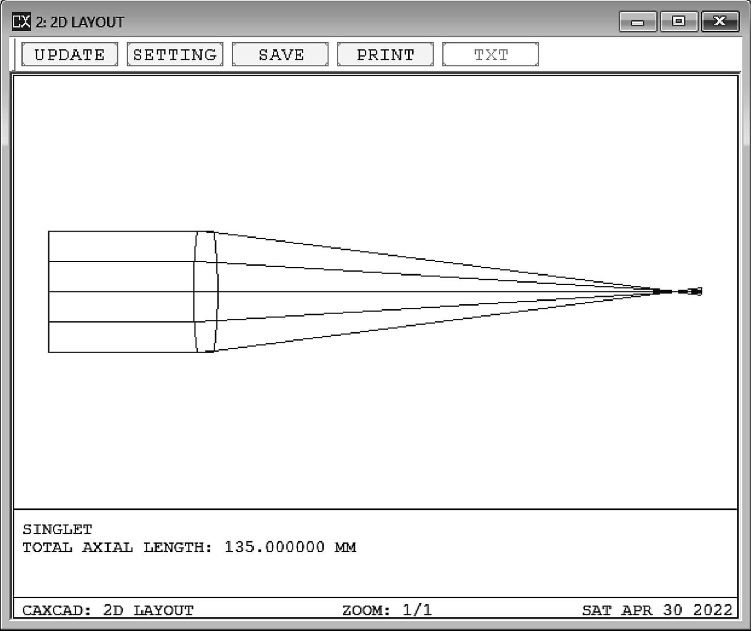 在实际的光学系统中,就需要着重强调“近轴”,因为此时计算焦点的位置是以近轴光线为基准的。建立一个焦距100 mm,入瞳为25 mm的单透镜(图1-11~图1-12):