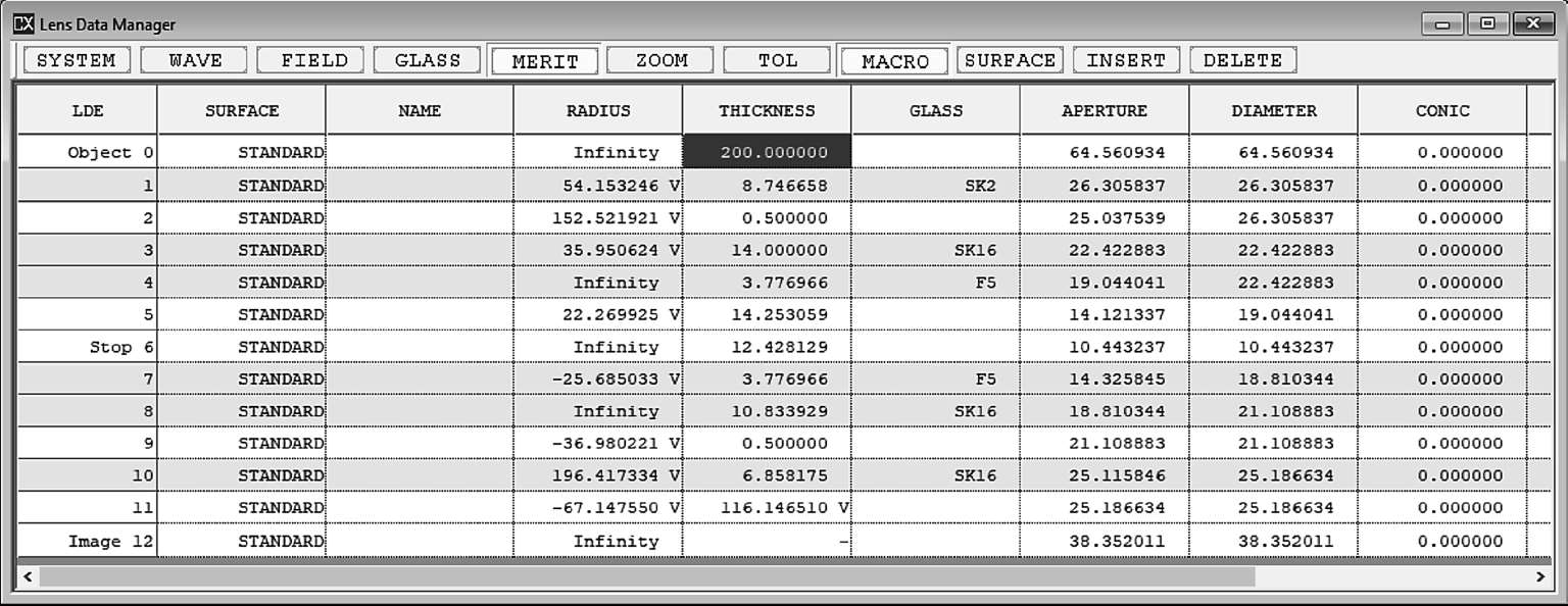 下面把双高斯镜头做一个变换,将物面厚度设置为200(图1-25~图1-26):