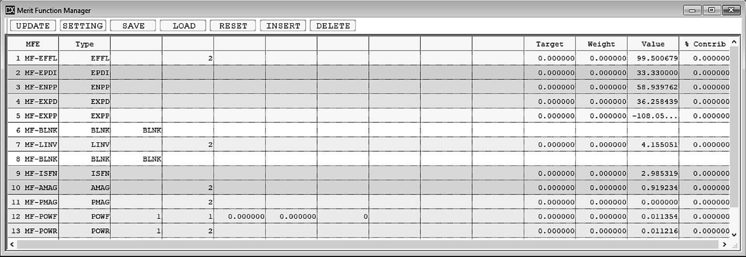 通过自动优化工具,列表中每个定义实际上都可以作为一个优化操作数快速插入到评价函数中,同时可以在图上看到这个定义简写的四个英文字母。关于操作数的使用,在优化章节中将会详细说明。