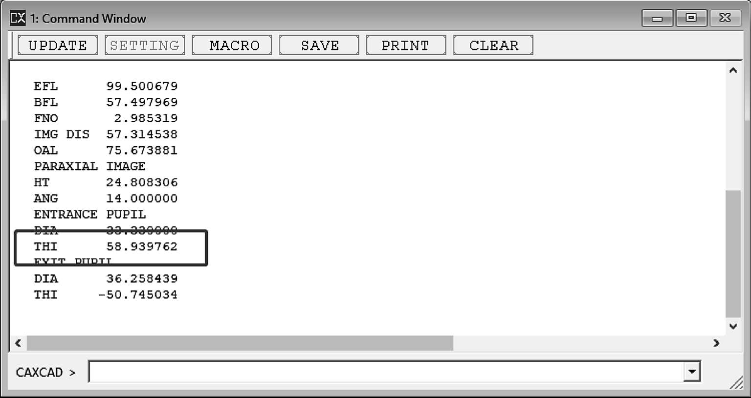 可以利用前面提到的任意一种方法来查看一阶光学数据中的入瞳位置,这里选择的FIR命令窗口,并确认数值是58.939 762(图1-18)。接下来要在光学系统中看到它,就需要用到一种方法,这种方法被称之为虚拟传播,所谓虚拟传播言外之意就是可有可无,并且对光学系统最终的成像没有影响。