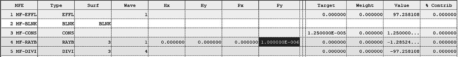 由此可知,近轴放大率可以快速近似获得系统放大率,但是和真实放大率相比,还是具有一定的差别。如图1-30所示,在评价函数中,利用Y方向的真实光线高度操作数RAYY(或REAY)分别获取像高和物高,再用DIVI计算它们的商,可以直接获得真实放大率,并且可以对这个比值进行控制和优化。