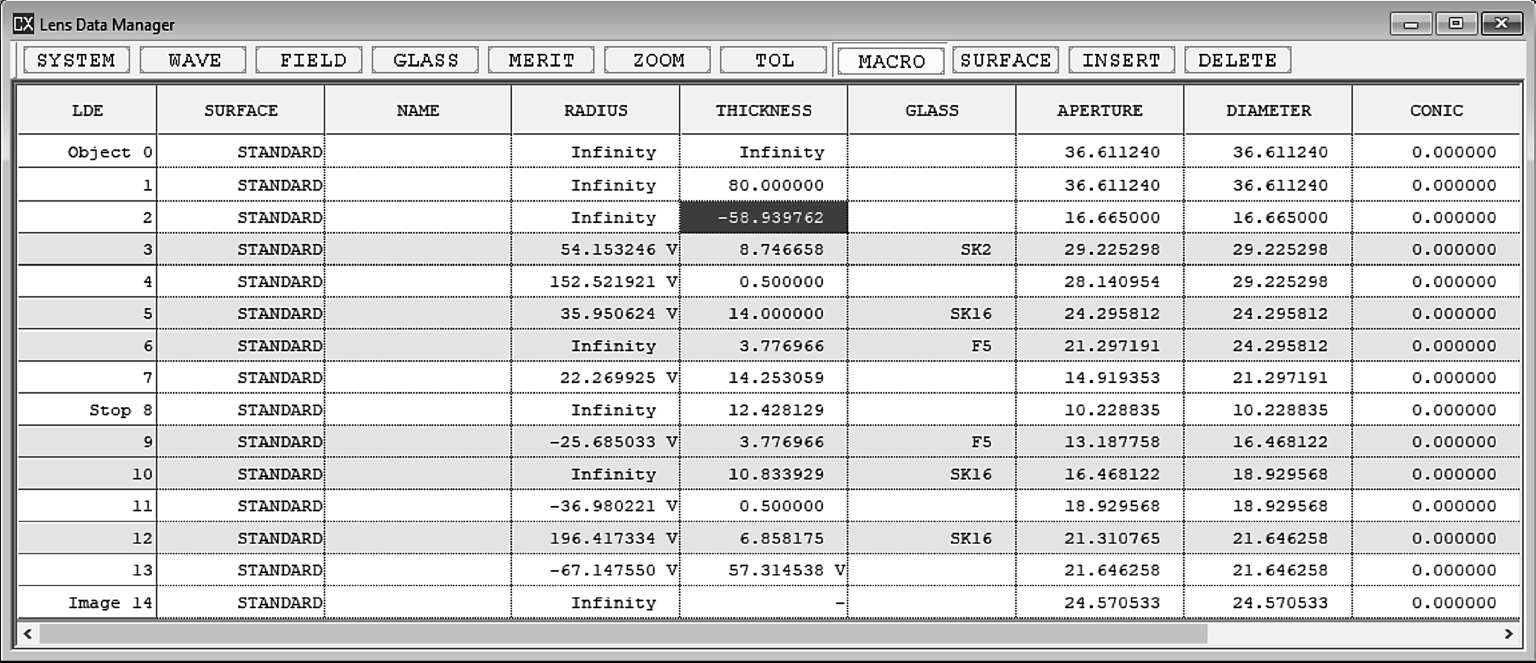 上图中80 mm的厚度是为了展示镜头前光线的入射,-58.939 762则是展示出了相对镜头第一个面(此时编号为3)的位置,也就是入瞳位置。