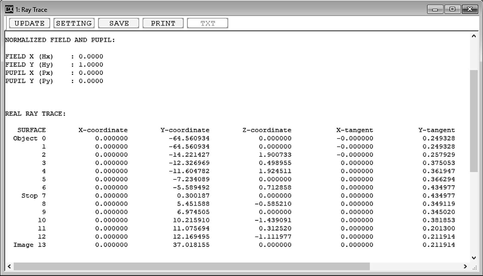 所以P y 作为归一化光瞳高度为0.000 001(图1-16)。利用RAYB可以获得光线在镜片最后一个面上Y方向的方向余弦为-0.000 000 128 523 989。然后根据三角函数的关系,就可以计算出有效焦距: