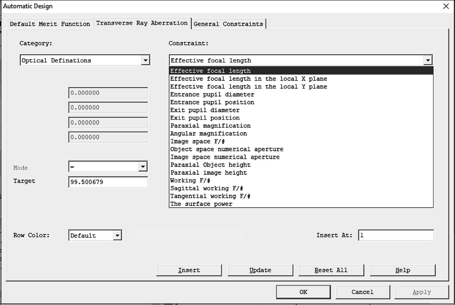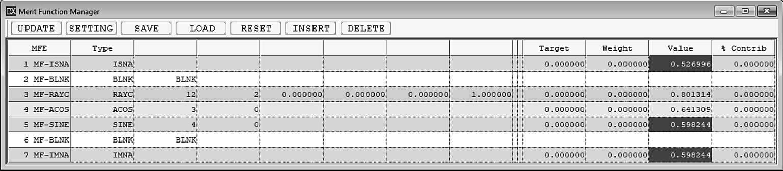 通过自动优化工具,列表中每个定义实际上都可以作为一个优化操作数快速插入到评价函数中,同时可以在图上看到这个定义简写的四个英文字母。关于操作数的使用,在优化章节中将会详细说明。
