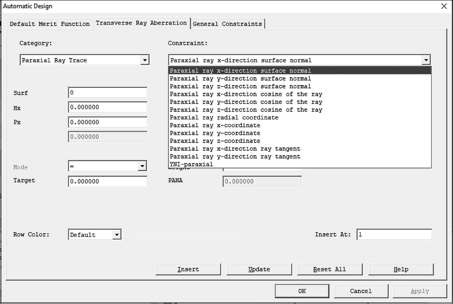 以上仅仅是查看这些数据的不同方法,在CAXCAD软件中,对这些概念进行了分类。如图1-8所示,打开自动优化工具,在横向色差列表里可以看到,重要的一阶光学定义都在这里。