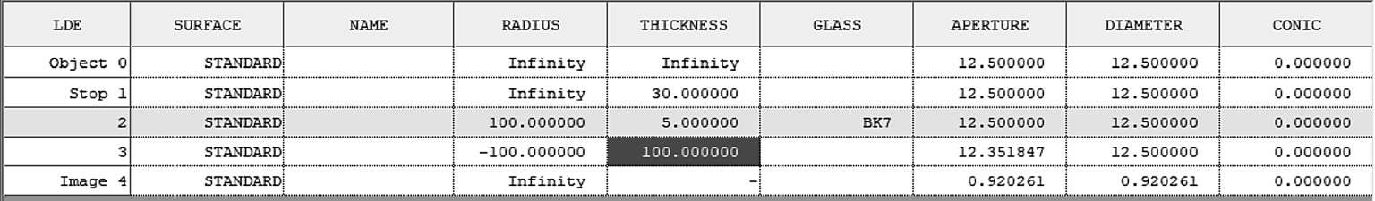 修改透镜数据编辑器,只需要在镜头前方插入两个空的面并定义厚度,如图1-19 所示: