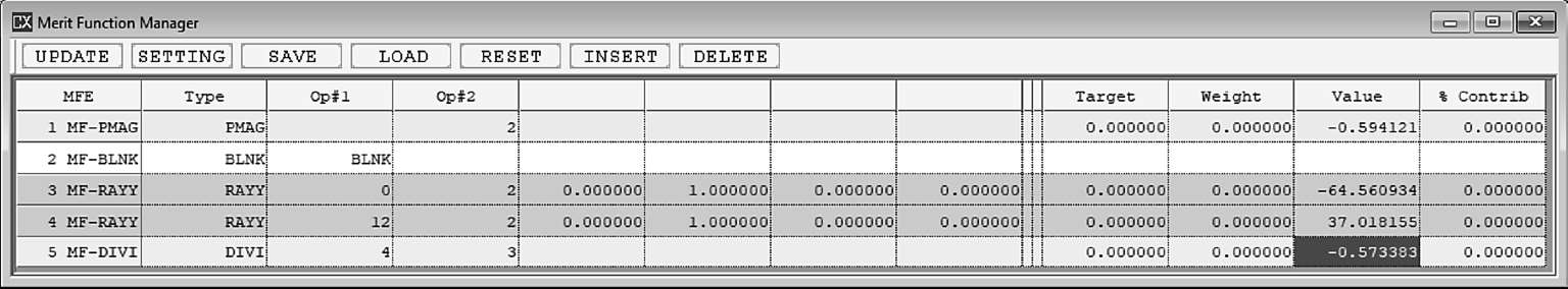 由此可知,近轴放大率可以快速近似获得系统放大率,但是和真实放大率相比,还是具有一定的差别。如图1-30所示,在评价函数中,利用Y方向的真实光线高度操作数RAYY(或REAY)分别获取像高和物高,再用DIVI计算它们的商,可以直接获得真实放大率,并且可以对这个比值进行控制和优化。