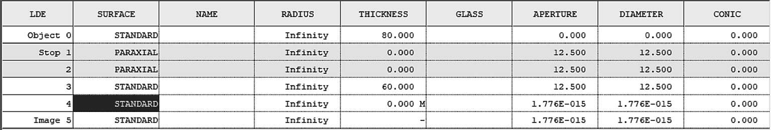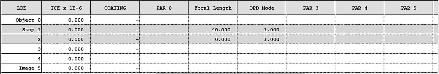 理想表面面型的数据和扩展数据如图1-35和图1-36所示,主要用来展示理想透镜的焦距(Focal Length)。