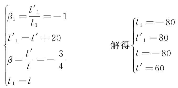 利用高斯公式和组合焦距公式,设两个透镜焦距分别为f' 1 、f' 2 ,l 1 、l' 1 是第一个透镜成像时的物像距,l、l'是两个透镜组合系统成像时的物像距。根据已知条件可列出如下方程组:
