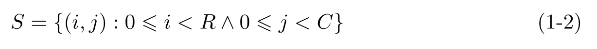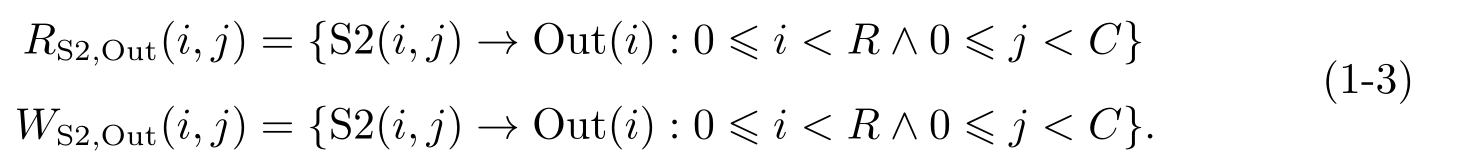 接下来介绍数据空间对应的访问函数。多面体模型要求对数据空间的访问函数必须是由符号常量或外层循环索引变量构成的近似仿射表达式。在多面体模型中,动态语句实例 S ( i )中对数组 A 的读访问和写访问可以分别用 R S,A ( i )和 W S,A ( i )来表示,其中, i 表示多面体中的一个迭代向量。对于一个语句中有多次对 A 的访问的情况,可以拆成多个基本访问操作。图1.3中的语句S2对Out数组的访问函数为