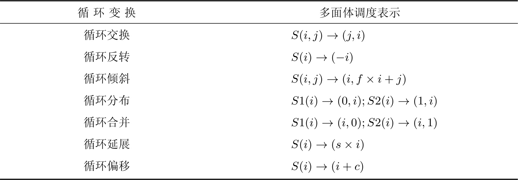表1.27 种常见的仿射变换及其对应的多面体调度表示