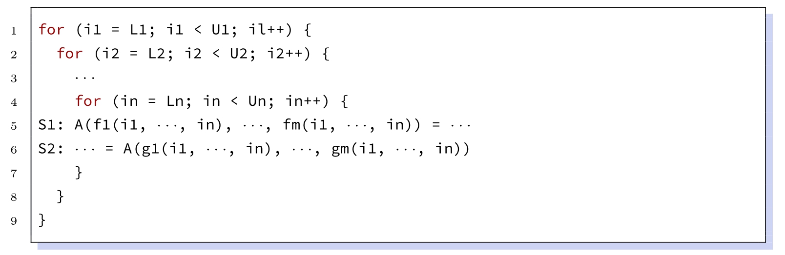 (1)迭代空间抽象:将一个 N 重嵌套循环抽象为一个 N 维迭代空间,每层循环的循环上界和循环下界的线性约束构成整个迭代空间的约束集合。这个 N 维迭代空间对应 N 重循环中各个循环索引变量的取值集合,只有满足约束的 N 维向量才是一个合法的迭代向量。
