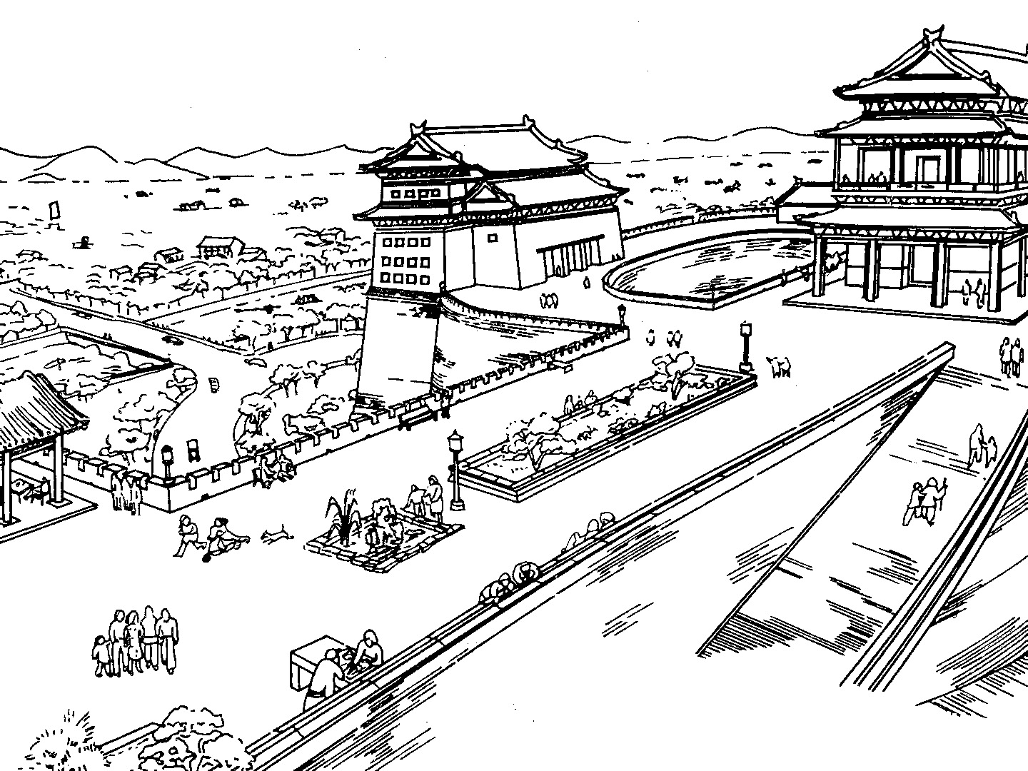 梁思成手绘。如图所示,若北京古城墙被保留,将成为全球罕见的景观以及市民休闲的场所